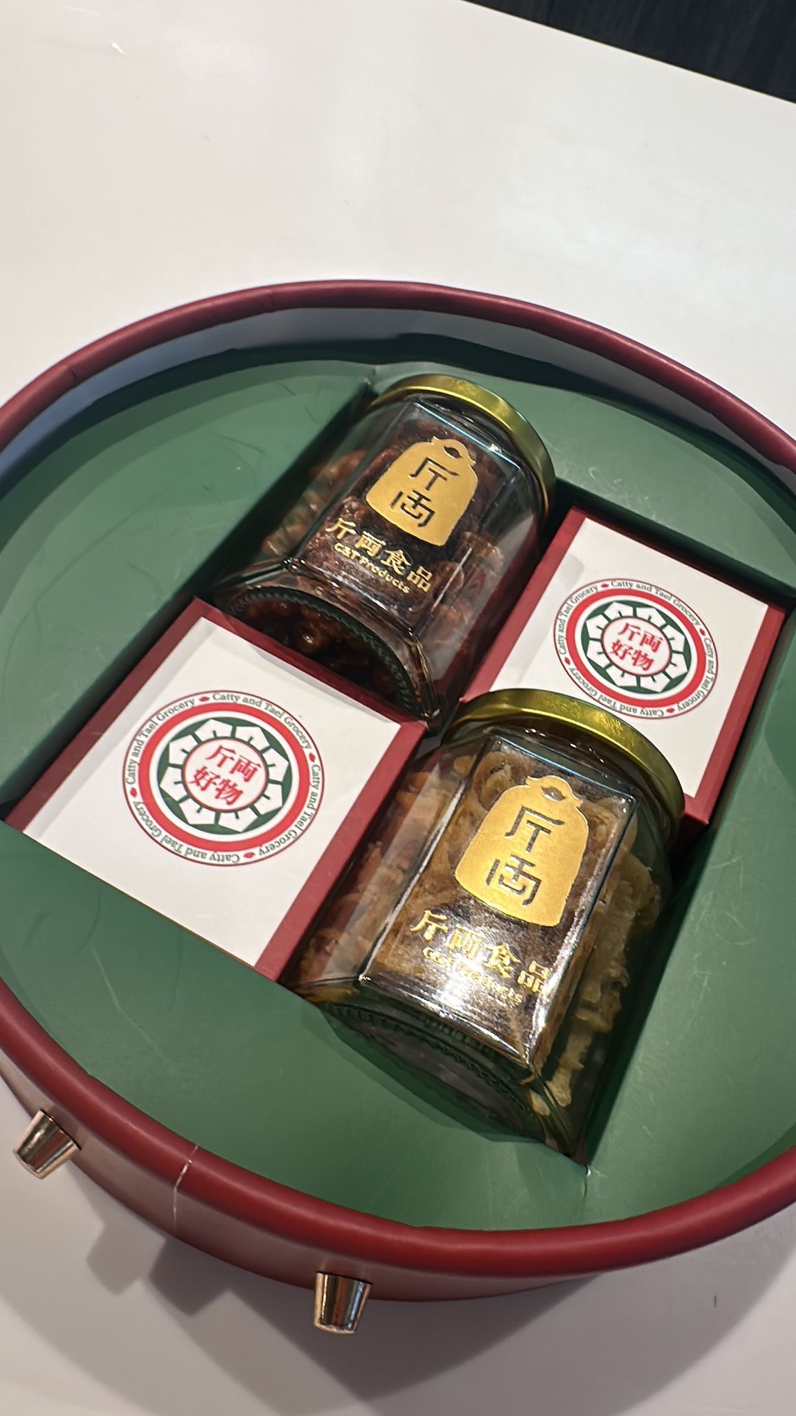 斤両團隊推出精選好物禮盒,匯聚四款極致美味,口感豐富,送禮自用皆宜,盡顯心意! 🌕脆脆椒鹽銀魚乾 1盒 本地頂級新鮮小銀魚配上特製椒鹽,鮮味更甜更濃,帶出獨有香港原生味道! 🌕海苔腰果 1盒 粒粒飽滿香脆腰果,裹上滿滿秘制海苔,香甜鮮脆,愉快滋味停不了。 🌕金香琥珀脆合桃 1樽 琥珀核桃色澤誘人,香脆少甜,令人難以抗拒。斤両所製的琥珀核桃,特別嚴選雲南頂級去皮合桃,自家秘方糖膠,拿捏精妙火候,做出每一粒都香脆爽口,齒頰留香。 🌕雜錦果仁 1樽 鬆脆腰果搭配香甜葡萄乾,天然零負擔,能量滿滿!